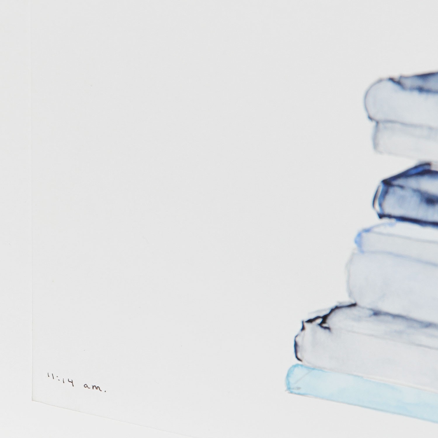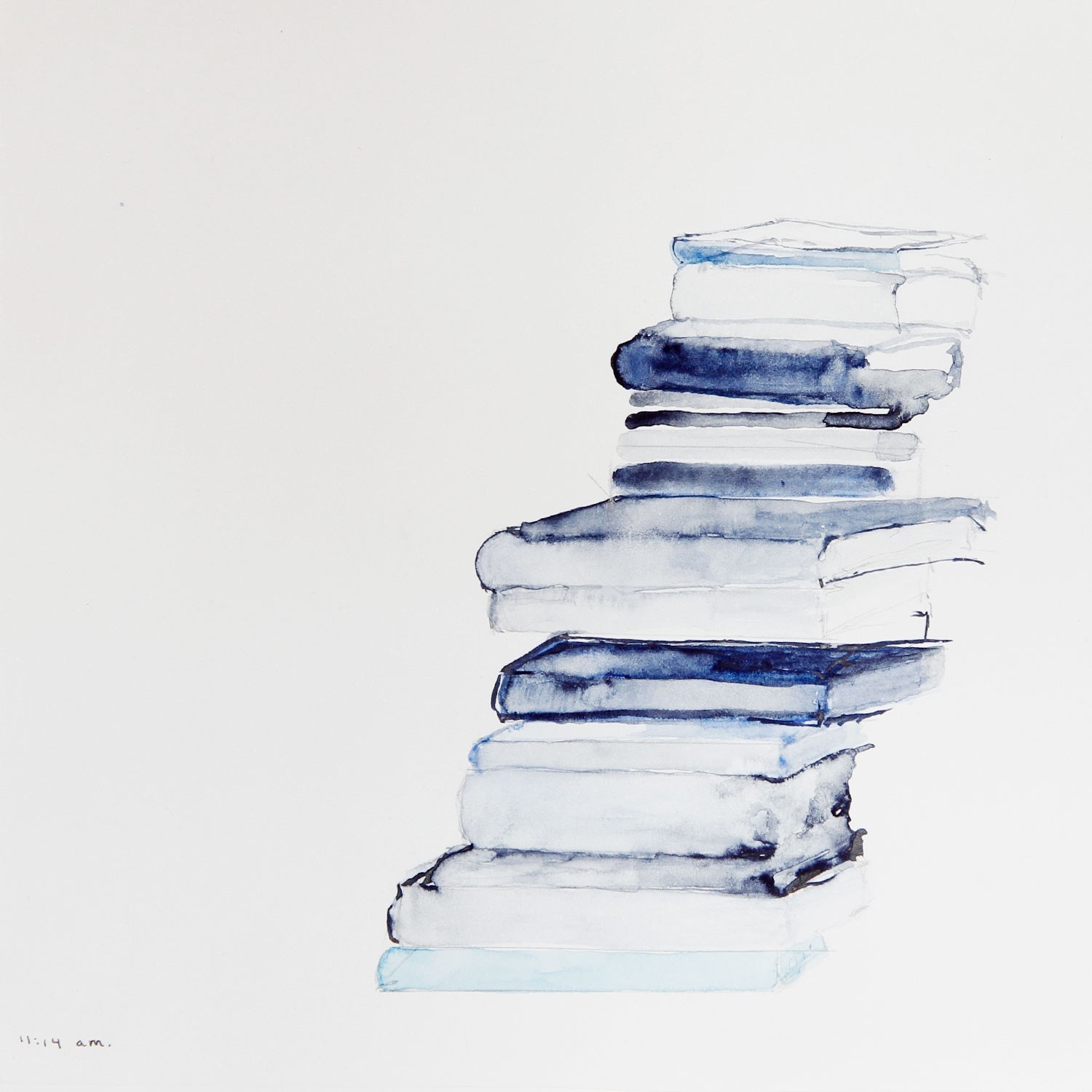 „Stacks Left Behind No 1“ und „Stacks Left Behind No 2“ heißen diese zwei zarten Aquarellarbeiten der in Los Angeles geborenen und heute wieder dort lebenden Künstlerin Marisa Mandler und wecken damit unsere Neugierde: Welche Bücher genau wurden da zurückgelassen und warum? Die Antwort bleibt uns die Künstlerin schuldig, denn die Bücherrücken tragen keine Titel. Im Fall von Nummer 2 sind sie zudem so gestapelt, dass es einem mit Blick auf die Stabilität dieses Bücherturms angst und bange werden kann. Aber vielleicht geht es der Künstlerin gar nicht um das Erzählen einer bestimmten Geschichte, sondern vielmehr um die Frage, wie sich ein Bild bzw. ein Objekt verändert, wenn wir es isoliert betrachten?