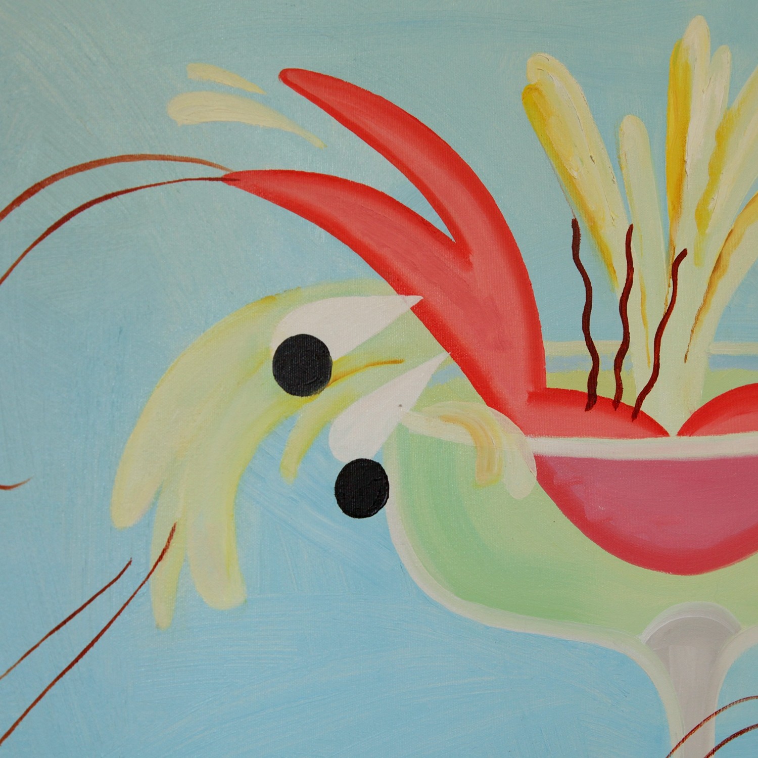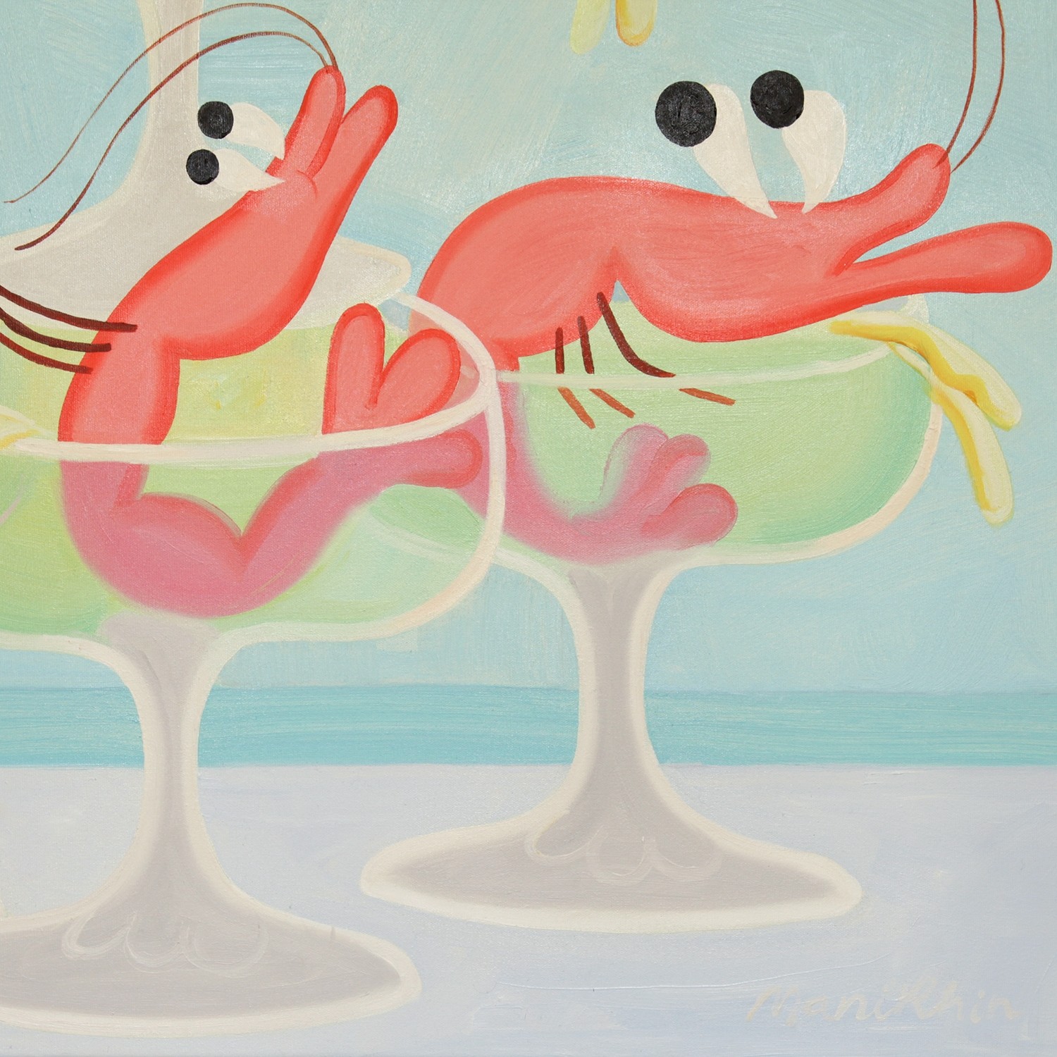 Das Bild „Aristocrat’s Breakfast“ ist in Motiv und Farbpalette ein typischer Manikhin und gleichzeitig ein besonderes Einzelstück. Es geht mit ironischer Ambivalenz noch über die Serie „Hummer gehen“ aus dem Jahr 2020 hinaus, auf der sich die zum Verzehr bestimmten Schalentiere noch halb rebellisch aus den präsentierten Gefäßen herausstehlen. Hier scheinen die Hummer genüsslich das Büffet übernommen zu haben, baden im Champagner und drehen den Spieß um, indem sie vom Objekt zum Akteur werden. Manikhin spielt hier so zugänglich wie klug mit den Formen des klassischen Stilllebens, das hier zur Freude des Betrachters aus der akademischen Tradition humorvoll zum Leben erwacht.