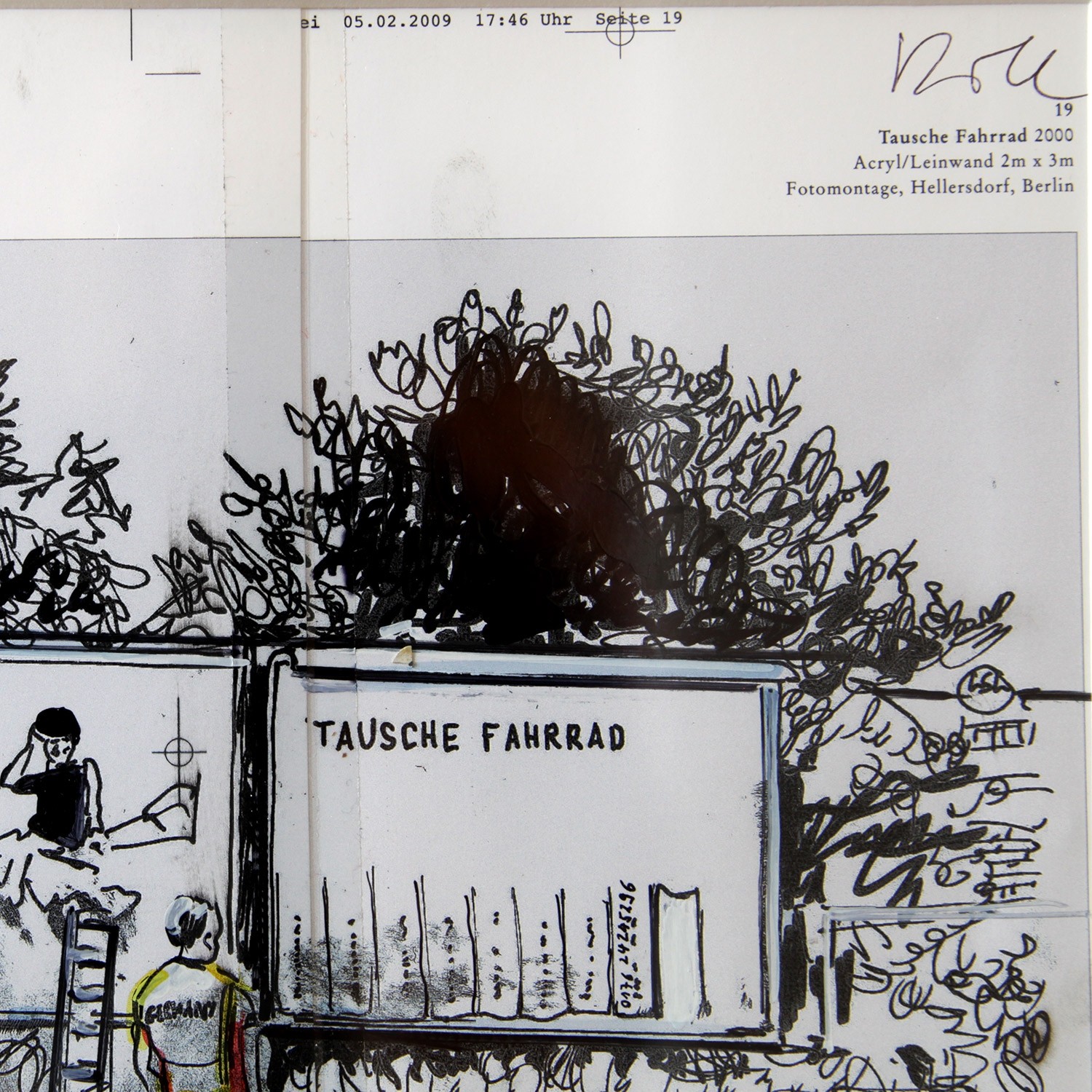 Tatjana Doll Nr. 19, Tausche Fahrrad, 2006/2021 Material Gescannte Handzeichnung, ausgedruckt als Katalogproof, weitergezeichnet, bemalt und handbearbeitet Edition Size 1 Measurement ca. 31,2 x 41 cm handsigniert inkl. Katalog: Tatjana Doll, DOLL, 2005, anlässl. der Ausstellung "Bier Für Öl + Ein Blinder Passagier" im Kunstverein Bremerhaven, 2005 Details about the frame Inkl. HALBE-Rahmen in Silber + Passepartout, Größe ca. 32 x 42 cm The new and affordable way to buy contemporary art Strictly limited and signed art editions Limited stock From emerging talents to today’s most sought-after artists Easy and free sign-up to shop our weekly deals SIGN UP NOW Already have an account? Über die Werke Der rote Ferrari ist auch eins der Motive in den Unikaten, die auf der Grundlage des Katalogs „DOLL“ aus dem Jahr 2005 entstanden sind. Darin sehen wir Tatjana Dolls Malereien in Form von Collagen in den städtischen Raum montiert. Die linearen Edding-Zeichnungen stammen aus dem Jahr darauf, zunächst waren sie gedacht als Wiederholung des Gedruckten in Schwarz-Weiß, wurden dann gescannt und wiederum als Print aufs Papier gebracht. Die Künstlerin hat sie später manuell durch malerisch-farbige Flächen ergänzt. Zudem holte sie den urbanen Raum dieses Mal in die Zeichnung und die Malerei hinein. „So, als wäre er wie die Malereien, die darin platziert sind, genauso ausgedacht“, erklärt Doll. Wer sich auf ihre Arbeiten einlässt, sollte sich also wappnen für das Wechselspiel zwischen Kunst und Wirklichkeit. „Die Piktogrammschilder ‚Caution‘ habe ich gemalt, um vor meinen eigenen Bildern zu warnen“, sagt sie auch. Die Warnung lässt sich aber ebenso als Aufforderung verstehen, die eigene Vorstellungskraft mindestens so wichtig zu nehmen wie die vorformulierten visuellen Erzählungen, von denen wir umgeben sind. Tatjana Dolls mutiges Werk macht vor, wie das geht. Über die Künstlerin Der Malerei traut Tatjana Doll einiges zu. „Wenn ich einen Ferrari male, dann sollte es so sein, als öffnete ich eine große Lackdose und er würde zu einem Auto schon in dem Moment, in dem ich den Lack auf die Leinwand gieße, nicht durch Ingenieurskenntnisse, sondern einfach durch das Material und die Farbe“, sagt die Künstlerin. Die Grenze zwischen Abbild und Wirklichkeit zieht sie nicht entlang der materiellen Realität. Oft übersteigt die Größe der Alltagsgegenstände in ihrer Kunst die ‚wahren‘ Maße bei Weitem. Genauso wie die Symbolkraft eines Ferraris seine Funktion als Rennwagen und Automobil bei Weitem übertrifft. „Ich wollte malen, was da ist“, erklärt Doll und holt auf diese Weise eine Welt in die Kunst, die uns alle umgibt. Bei Doll ist der Schaffensprozess als ein Akt der subjektiven Aneignung zu verstehen, der Gegenstand an sich tritt hinter das Bild zurück. Möglich also, dass wir in dem LKW-Rücklicht plötzlich nur noch einen gelben Lackfleck sehen – und fernab vorgegebener Denkmuster auf produktivste Art und Weise auf uns selbst zurückgeworfen sind. Latest Exhibitions (Selection) Tatjana Doll stellt als Rompreisträgerin der Deutschen Akademie Rom Villa Massimo gemeinsam mit den anderen ausgezeichneten Künstler*innen aktuell auf Schloss Neuhardenberg aus (bis 31.10.2021). „Was heißt Untergrund?“ ist der Titel ihrer Soloschau im KINDL ‒ Zentrum für zeitgenössische Kunst in Berlin (bis 27.2.2022). 2018 wurde Doll zudem mit dem Konrad-von-Soest-Preis des Landschaftsverbands Westfalen-Lippe ausgezeichnet, ihre Werke zeigte man seinerzeit ebenfalls im Rahmen einer Soloausstellung. Links of Interest (Selection) Webseite von Tatjana Doll 2021 erhielt Tatjana Doll den Fred-Thieler-Preis für Malerei, verliehen von der Berlinischen Galerie „art in berlin“-Interview mit Tatjana Doll (2015